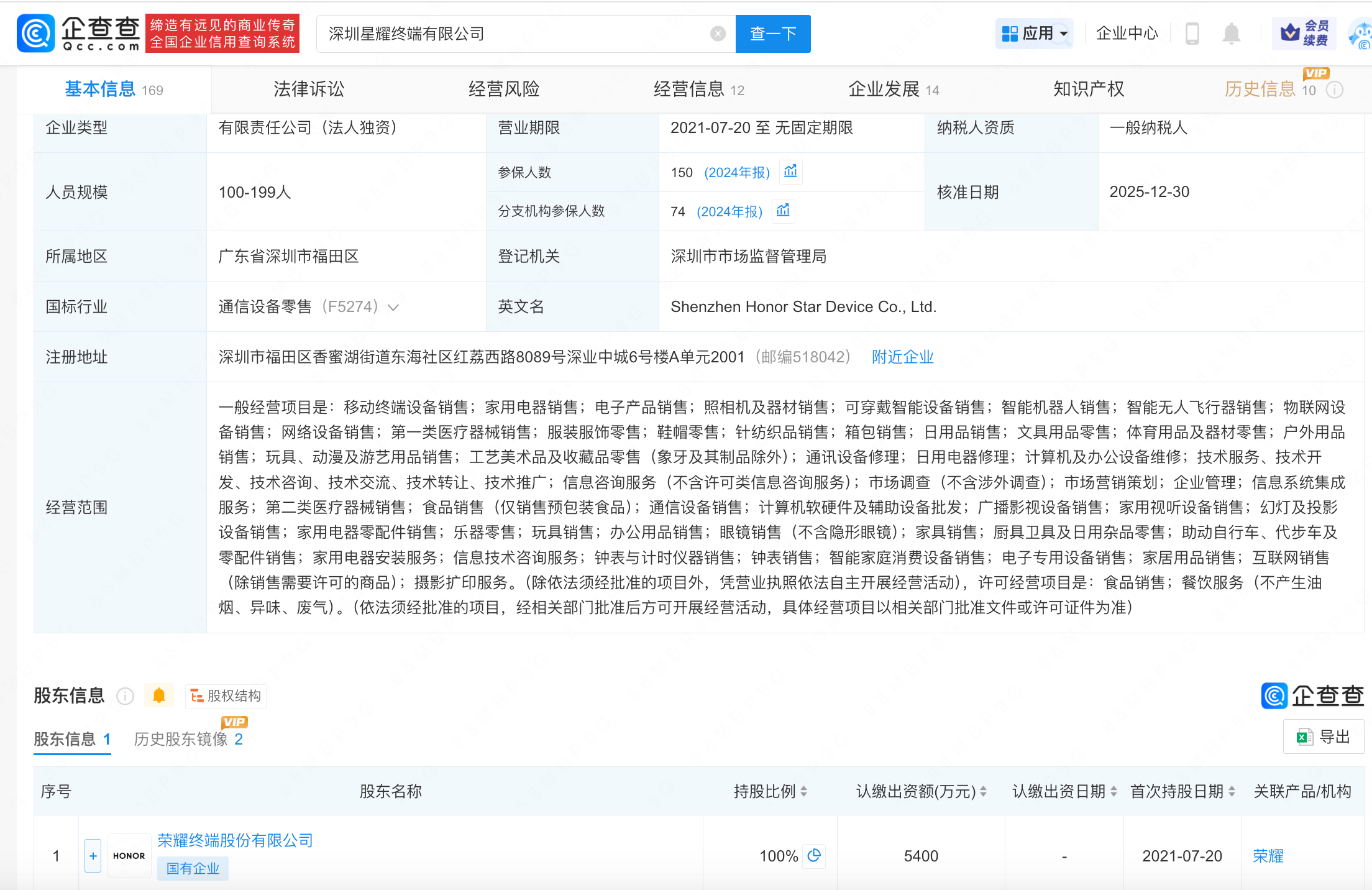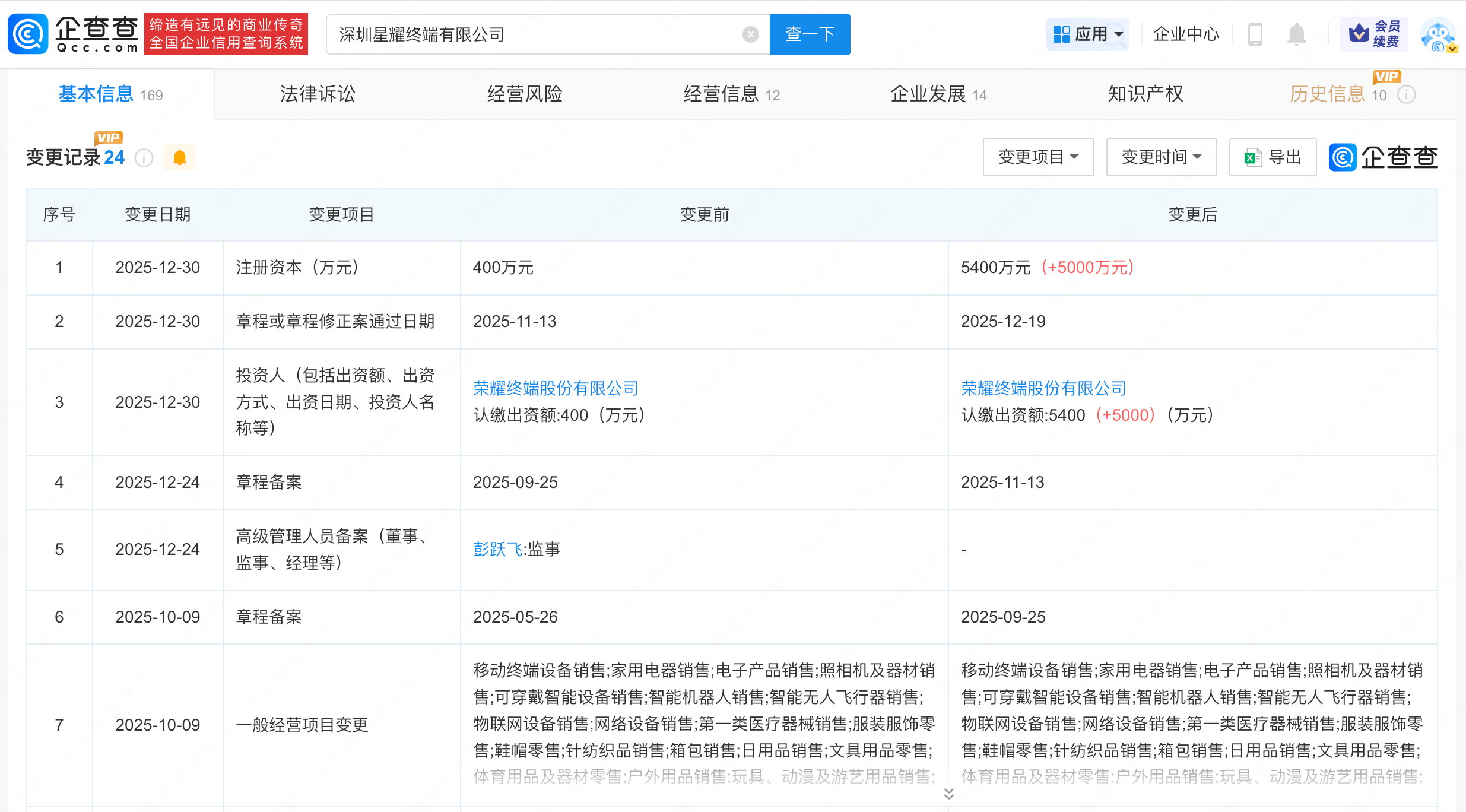 近日,深圳星耀终端有限公司发生工商变更,注册资本由400万人民币增至5400万人民币,增幅1250%。企查查信息显示,该公司成立于2021年7月,法定代表人为文洁,经营范围含移动终端设备销售、家用电器销售、电子产品销售等,由荣耀终端股份有限公司全资持股。